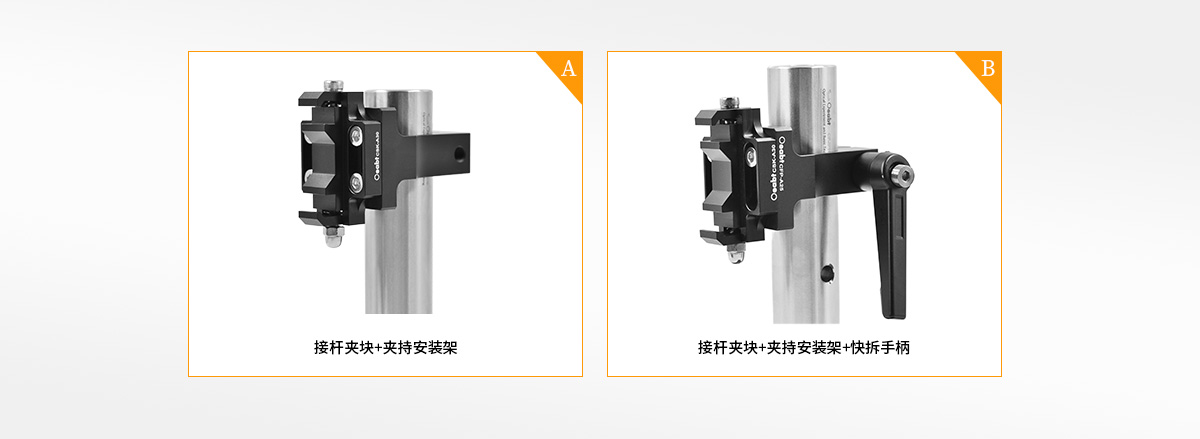 (2)這是安裝了快拆手柄的套件裝置,可快速調(diào)節(jié)夾持式安裝架:拆卸手柄用于將夾塊固定在接桿上。手柄長度2.36英寸(60mm) ,包含一個1/4"-20 (M6)螺栓,可直接旋轉(zhuǎn)手柄安裝,縮短了基本設(shè)置和對準(zhǔn)所需的時間,以便調(diào)節(jié)夾持式安裝架。