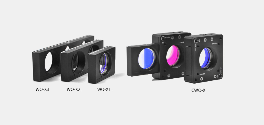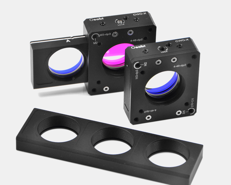CWO-X濾光片安裝座的主體頂部有一個(gè)彈簧性的鎖銷機(jī)制,? 將每個(gè)濾光片與籠式系統(tǒng)的機(jī)械軸對(duì)準(zhǔn)。 頂部有固定螺絲,用于鎖定插條的位置。周邊的3顆螺絲用來(lái)固定鎖銷的位置,不能調(diào)節(jié)。可以沿著光路堆疊多個(gè)濾光片安裝座 (濾光片安裝座附帶1個(gè)WO-X2的插條,如需額外的插條需另外拍下);