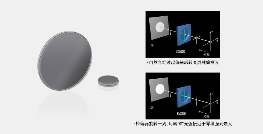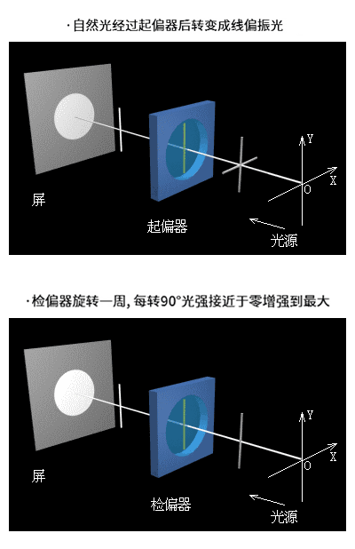 偏振片對(duì)入射光具有遮蔽和透過(guò)的功能,可使縱向光或橫向光一種透過(guò),一種遮蔽。可以把入射光、復(fù)合光、或單色光變成線偏振光,再經(jīng)過(guò)偏振片使光完全消光。