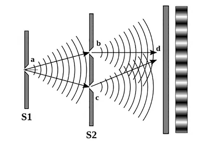 ? ? ? ?出現(xiàn)這種明暗條紋的的原因是因為光是一種波。當(dāng)光通過兩條狹縫后,相當(dāng)于在兩個狹縫出口處產(chǎn)生了兩條新的波。這兩條波在背景板不同的位置上會產(chǎn)生干涉。在明條紋處,兩條光波到達時它們的波峰剛好疊加在一起,波的強度加大,所以產(chǎn)生了較亮的條紋。而在暗條紋處,兩條波的波峰和波谷剛好抵消,波的強度減弱,形成了較暗的條紋。