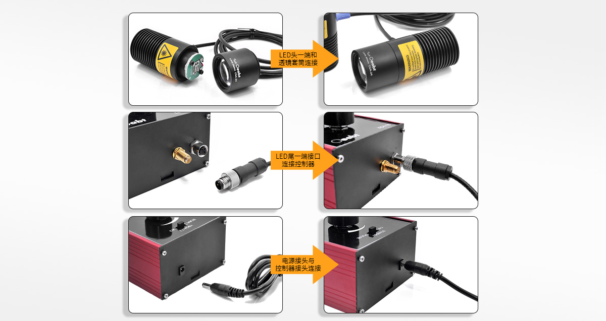 連接使用:LED光源頭一端有SM1(1.035”-40)內(nèi)螺紋,和安裝了鏡片的SM1外螺紋套筒連接。再將電源接口與控制器尾端接頭、LED尾端與控制器接口對準有卡槽部分然后擰上鎖緊螺絲。通電狀態(tài)下,用戶可左右切換選擇CW(連續(xù)波)和PULSE(脈沖波)雙模式。只需操作一個集成了開關功能的電位器旋鈕,即可控制輸出電流大小,控制光亮強弱。