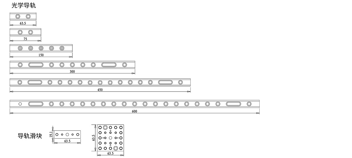 (1)OOM-L系列光學(xué)導(dǎo)軌用于構(gòu)建緊湊型組件。燕尾式安裝表面可以安裝我們的OOP-U系列卡入式導(dǎo)軌滑塊,物體能沿著燕尾式安裝表面固定在任何位置。這些導(dǎo)軌只有18.1mm的寬度,長度范圍是63.5-600mm,導(dǎo)軌具有多個M6沉頭孔槽,以實現(xiàn)安裝靈活性。每個導(dǎo)軌端部的M4螺紋孔可用于垂直安裝。長度在300 mm以上的導(dǎo)軌具有安裝槽,從而提供更多安裝選擇。