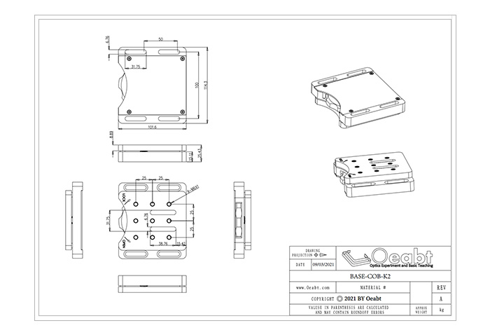 BASE-COB-K2 |?規(guī)格:114.3*101.6*25.4mm; 頂板螺紋:9處M6, 2條38.6*6.7mm沉頭孔槽; 重量: 565.1g; |