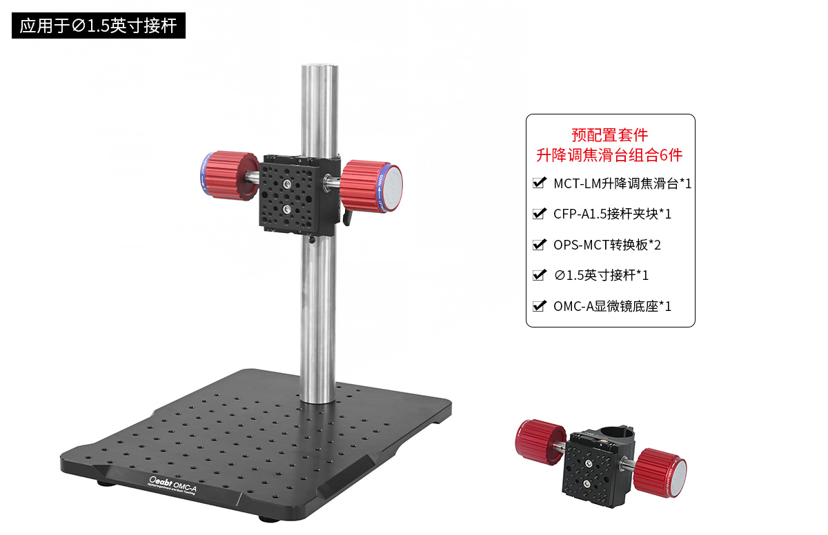 該預(yù)裝置套件由MCT-LM2升降調(diào)焦滑臺、CFP-A1.5 接桿連接件、OPS-M2&OPS-M406A轉(zhuǎn)換板、CFEP-S系列 ?1.5英寸接桿、OPS-MO 蓋板、OMC-A 顯微鏡底座為組合件出售。應(yīng)用于?1.5英寸接桿,下拉提供多種預(yù)裝置安裝選項可購買。