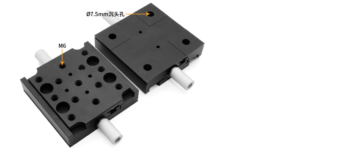(3)位移臺(tái)上表面的螺紋孔陣列有13處M6螺紋孔,增加了運(yùn)動(dòng)組件的安裝選擇。底面具有4處?7.5mm沉頭孔,可將位移臺(tái)固定到光學(xué)平臺(tái)或面板上。