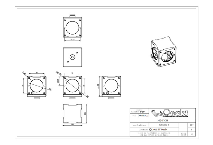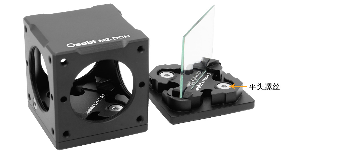 (2)立方體底座包含一個LFM1-A2矩形內(nèi)夾具,夾持好矩形鏡片后,利用2個柱頭螺絲固定到底座上,而底座和立方體外殼則利用2處平頭螺孔連接。