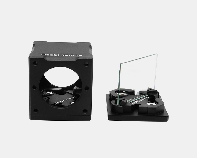 立方體底座包含一個LFM1-A2矩形內(nèi)夾具,安裝25-36mm寬、26mm高和3mm厚的矩形光學元件,比如二向色反射鏡、分束鏡、反射鏡或偏振帶通濾光片。夾持好矩形鏡片后,利用2個柱頭螺絲固定到底座上,而底座和立方體外殼則利用2處平頭螺孔連接。