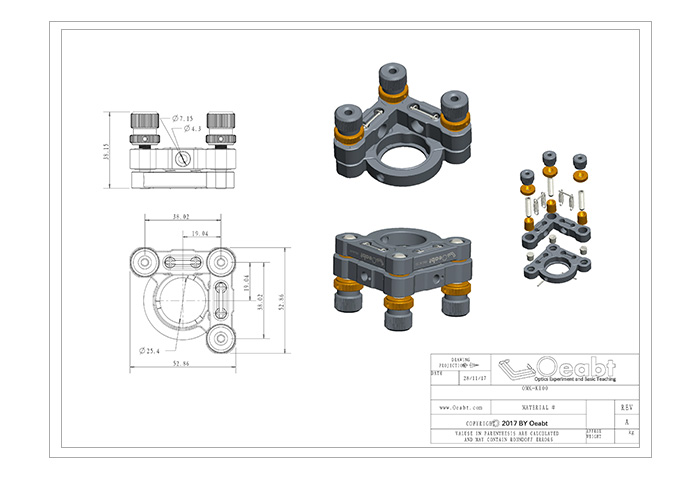 精密三軸調(diào)整架,用于安裝?1英寸光學(xué)配件。這些調(diào)整架提供±4 °的傾斜角度調(diào)節(jié)范圍。能以左手或右手方向安裝,并且通過限位安裝孔以三點(diǎn)固定反射鏡。?1英寸和調(diào)整架上的旋鈕可拆卸掉,從而露出絲杠末端的內(nèi)六角套筒。我們也提供反射鏡前表面中心線與接桿中心對準(zhǔn)的光學(xué)調(diào)整架。這種設(shè)計能方便地將45°入射的光束與光學(xué)平臺螺紋孔陣列對齊。