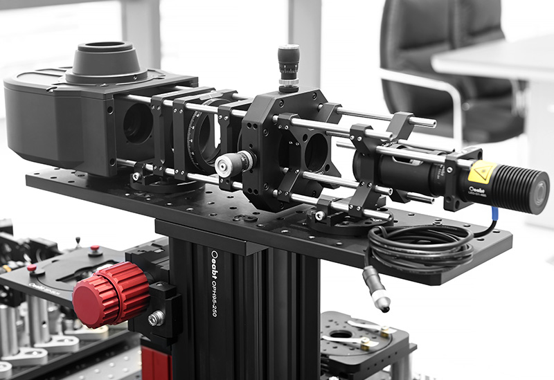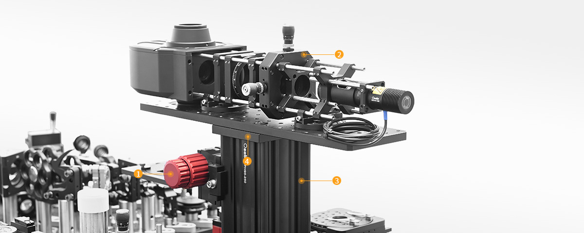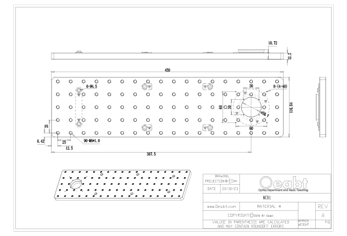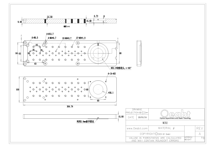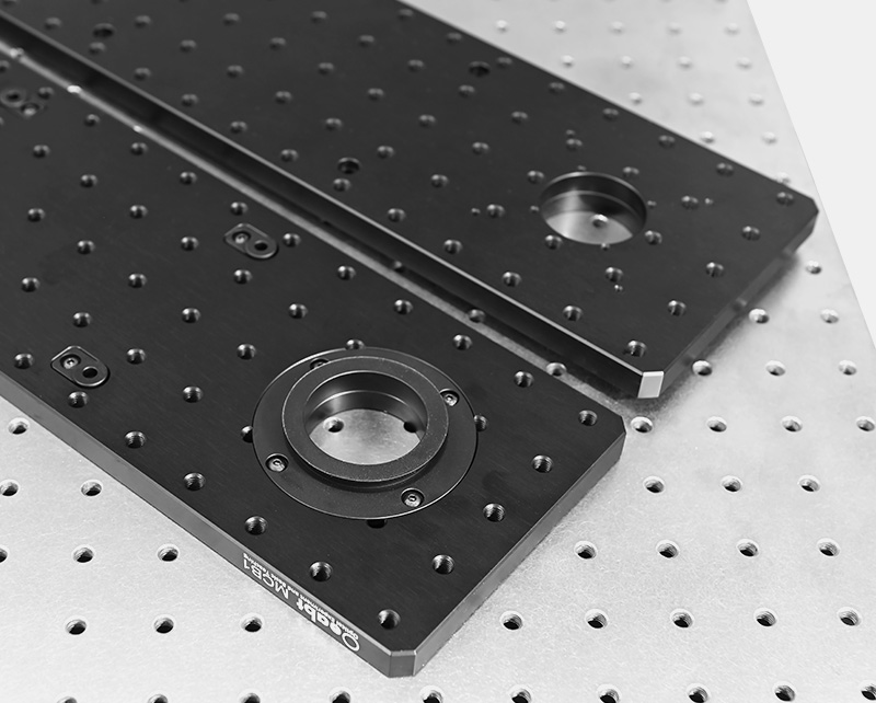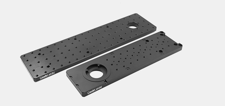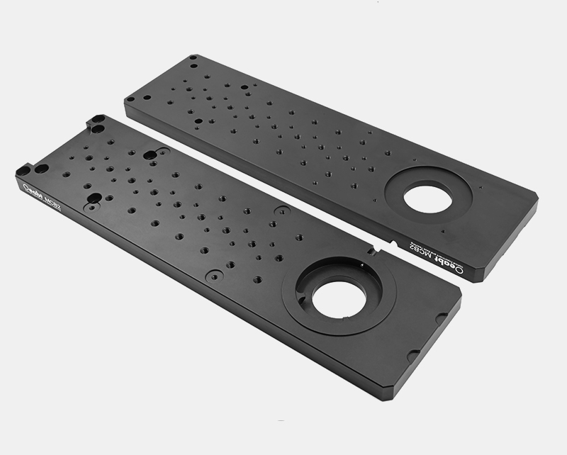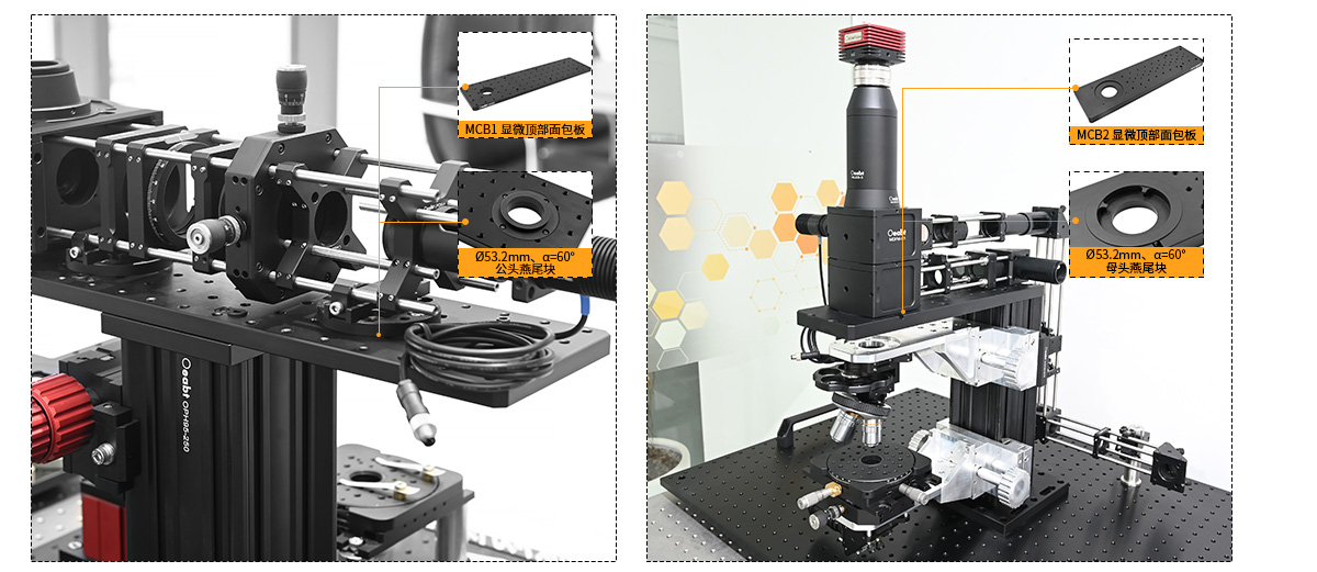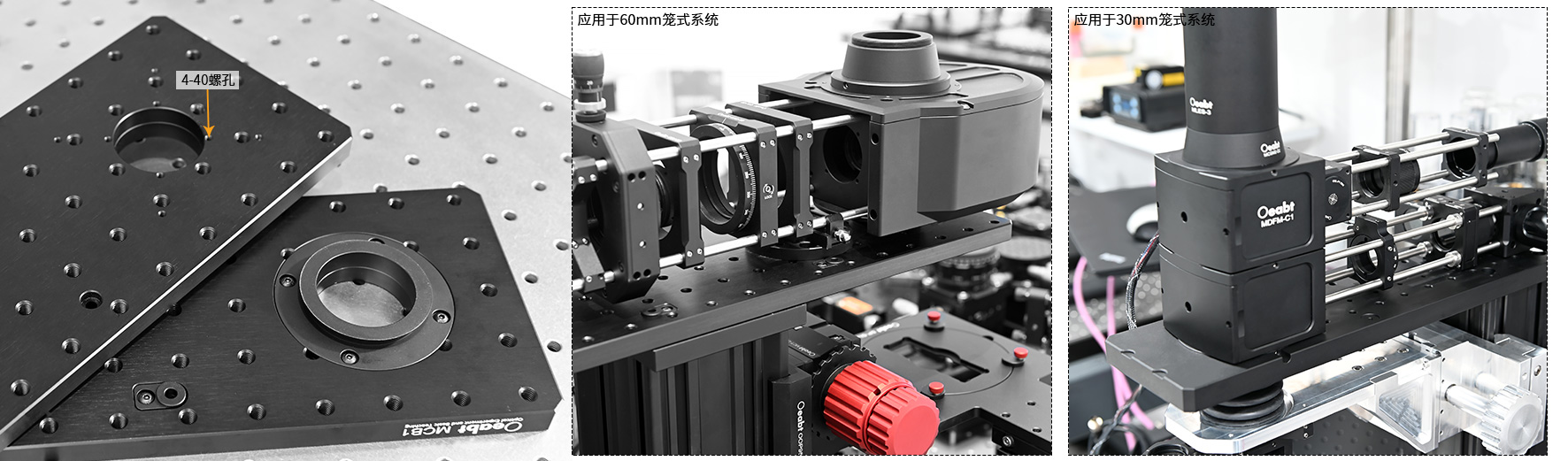 MCB系列面包板是用于Oeabt顯微成像系統(tǒng)頂部搭建自定義寬場(chǎng)觀測(cè)裝置和落射照明路徑,面包板有一個(gè)?51mm的公頭燕尾塊,燕尾中心開(kāi)有?38.1mm的通孔,做成像系統(tǒng)的光軸路徑。