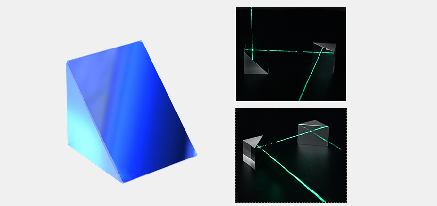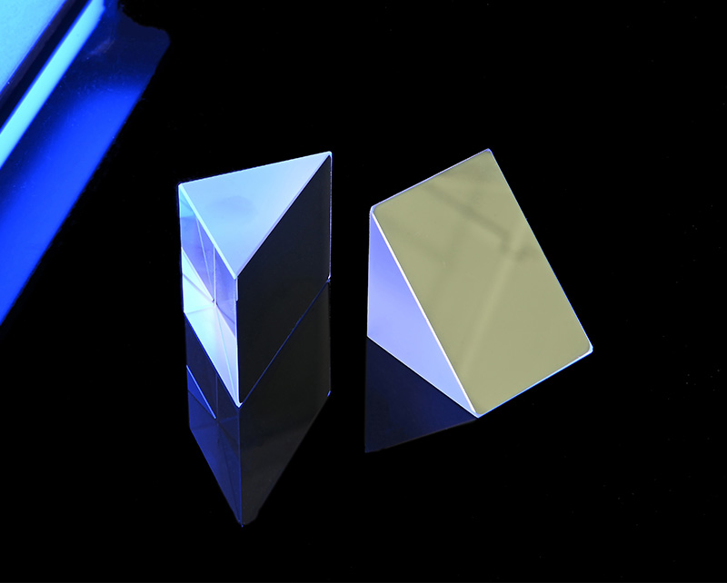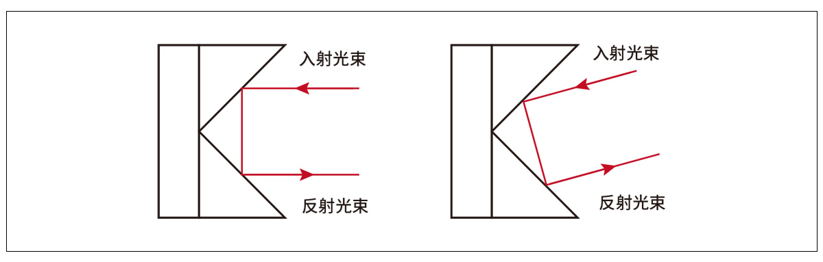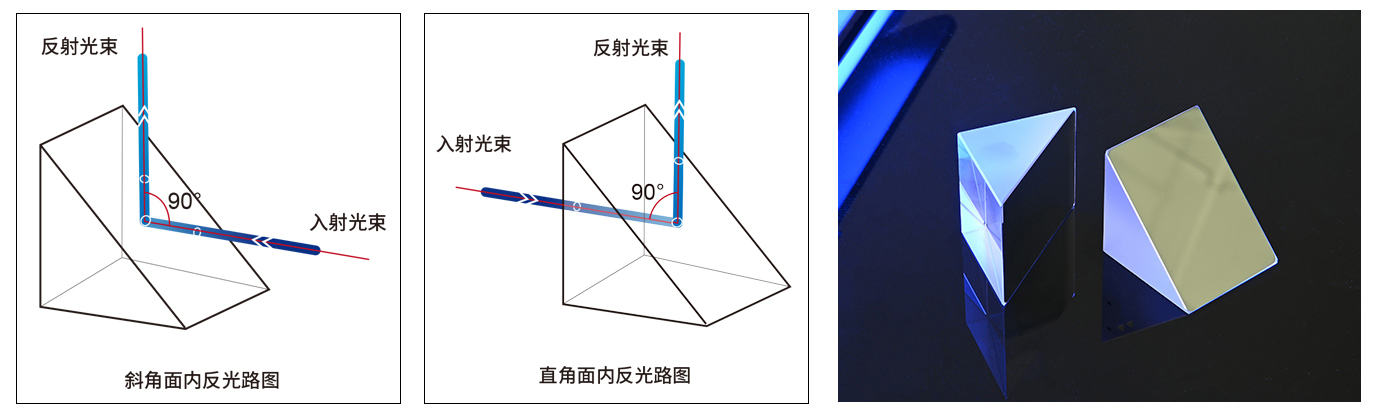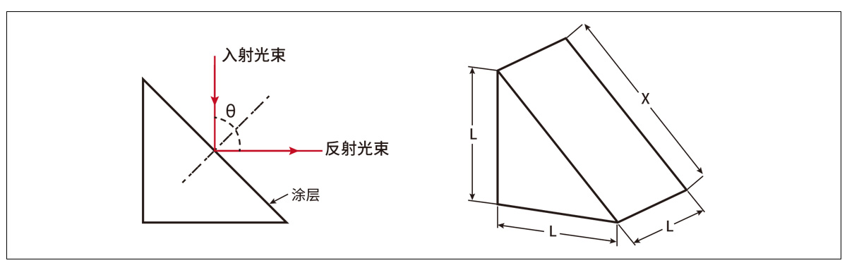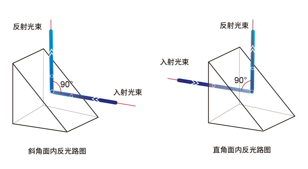 直角反射鏡基體是等腰直角三棱柱,其中兩個(gè)邊之間的夾角為90°,而斜面的外表面是反射面,鍍有寬帶介質(zhì)膜。