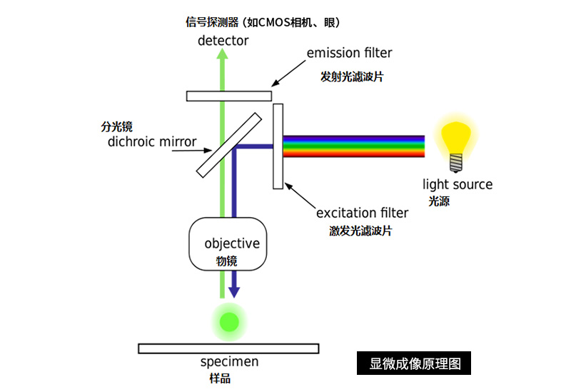 (1)激發(fā)光照射:熒光顯微鏡使用高強度的光源(如氙燈、汞燈或激光)產(chǎn)生特定波長的激發(fā)光,通過光學(xué)濾光片引導(dǎo)這些光線照射到樣本上。