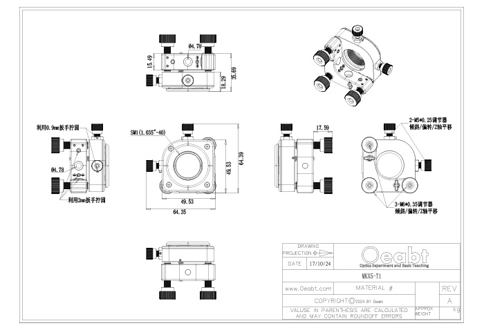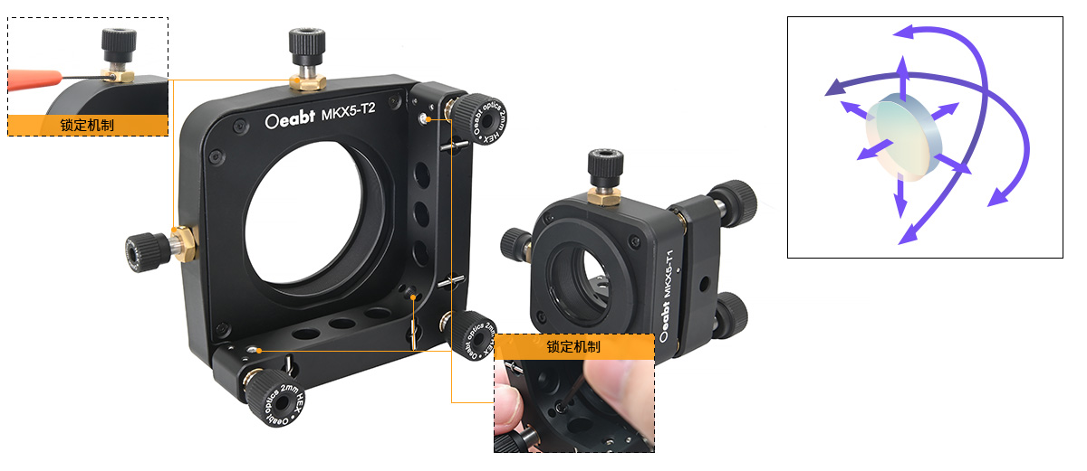 五軸光學(xué)調(diào)整架支持光學(xué)元件在俯仰、偏轉(zhuǎn)和XYZ五個(gè)軸向上的調(diào)節(jié)。所有五個(gè)軸均配備鎖定機(jī)制,確保調(diào)節(jié)后光學(xué)元件位置的穩(wěn)定。