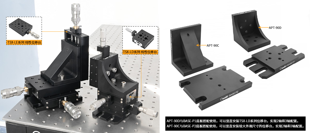 垂直組裝轉(zhuǎn)接板很適合需要XY配置的位移臺或XYZ多軸配置,兩種外觀尺寸的安裝板適用于大多數(shù)常規(guī)位移臺。