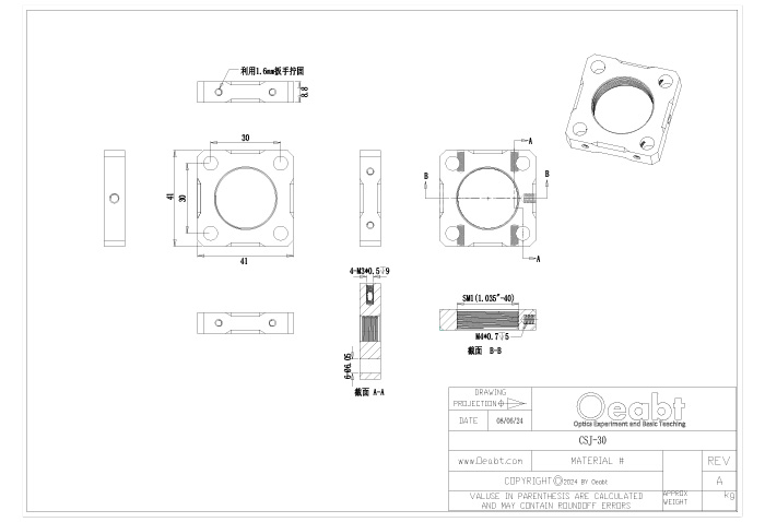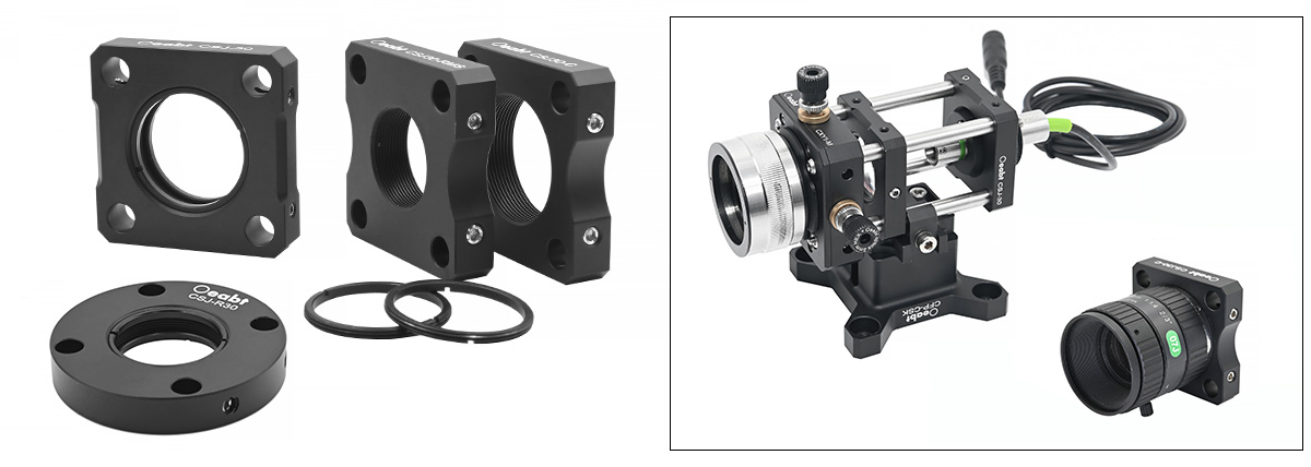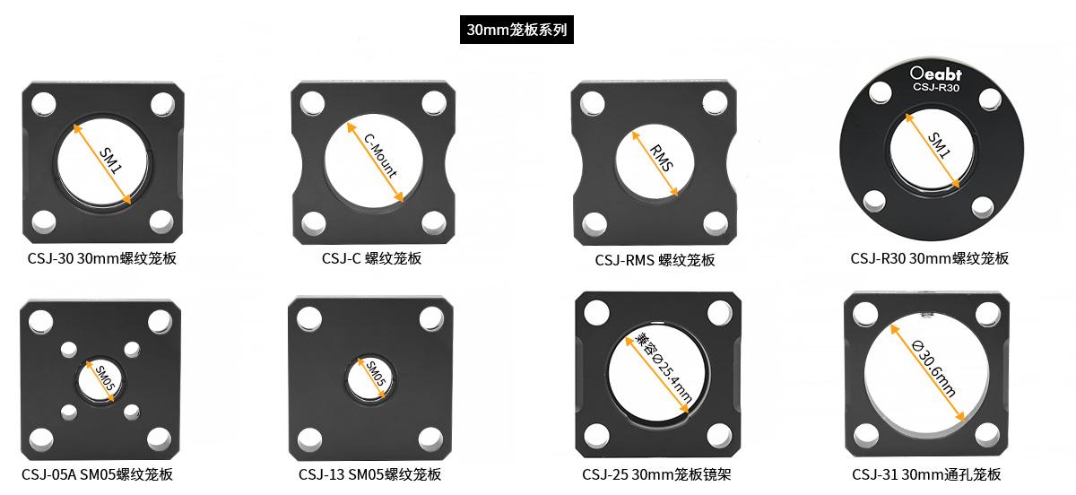 CSJ-30和CSJ-R30籠板中心的SM1(1.035”-40)螺孔,與?1英寸透鏡套筒兼容。而CSJ30-C可對接安裝C-Mount外螺紋的相機(jī)鏡頭組件,CSJ30-RMS可將顯微物鏡等RMS螺紋元件集成到30mm籠式系統(tǒng)。