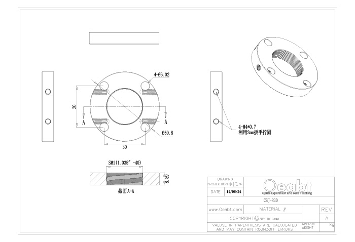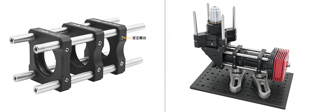 (2)CSJ-30和CSJ-R30籠板中心的SM1(1.035”-40)螺孔,與?1英寸透鏡套筒兼容。附帶2個SM1卡環(huán),可以直接安裝最厚4.7mm的?1英寸光學(xué)元件。而CSJ30-C可對接安裝C-Mount外螺紋的相機(jī)鏡頭組件,CSJ30-RMS可將顯微物鏡等RMS螺紋元件集成到30mm籠式系統(tǒng)