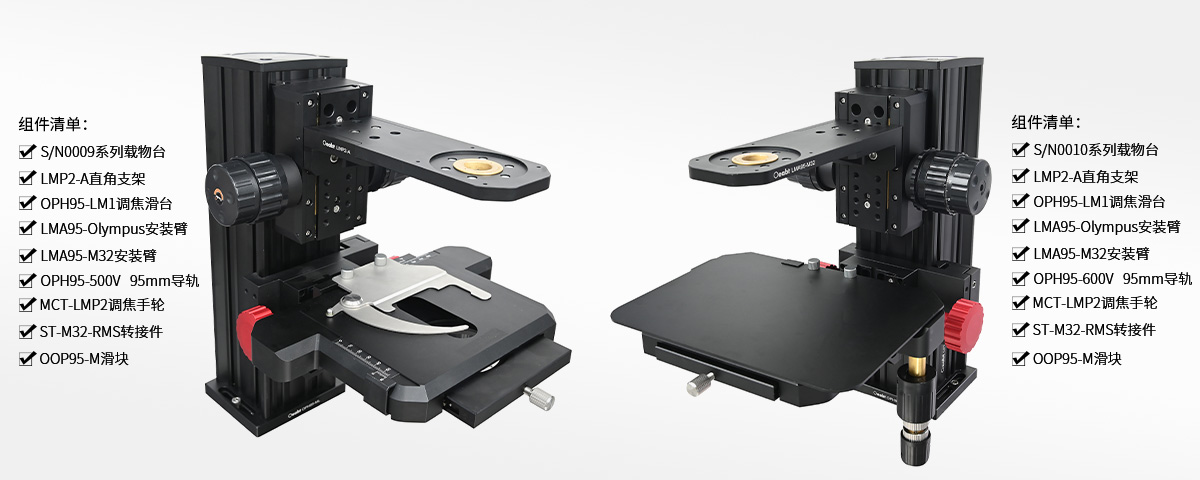 S/N0009或S/N0010載物臺、OPH95-V系列95mm導軌、MCT-LMP2調焦手輪、LMP2-A直角支架、LMA95-M32安裝臂、ST-M32-RMS轉接件、OPH95-LM1調焦滑臺、LMA95-Olympus安裝臂、OOP95-M滑塊 |