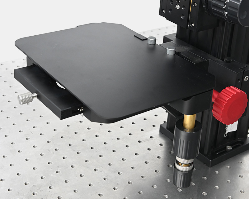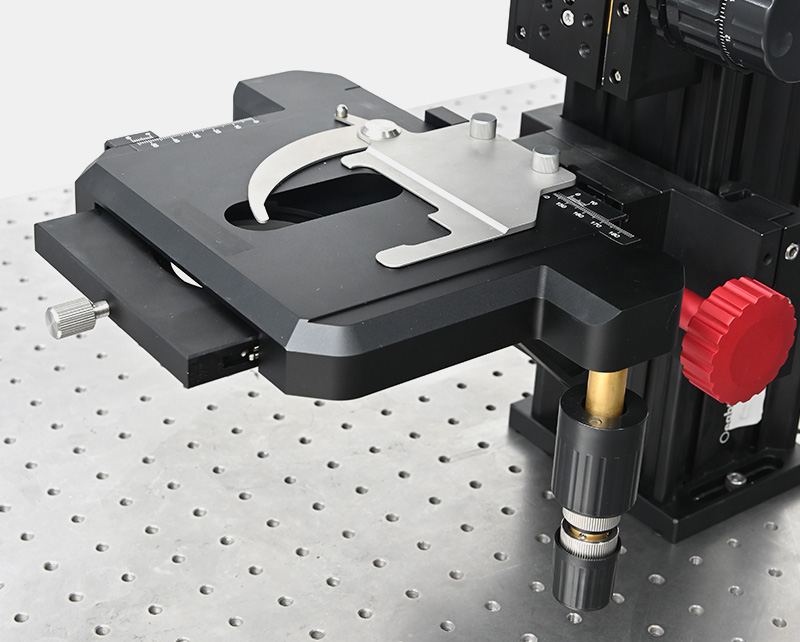 載物臺采用滾珠軸承傳動,每根軸的邊沿有精度為100μm的游標刻度,便于定位樣品。