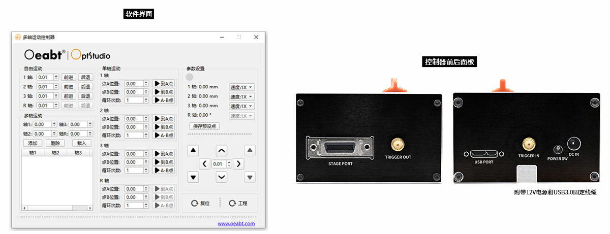 注*:最高、最低運動速度及點動距取決于運動控制器的脈沖頻率及設(shè)定,因此上述*號標(biāo)注參數(shù),均為采用Oeabt? O’motion 四軸運動控制系統(tǒng)下的測試結(jié)果。 |